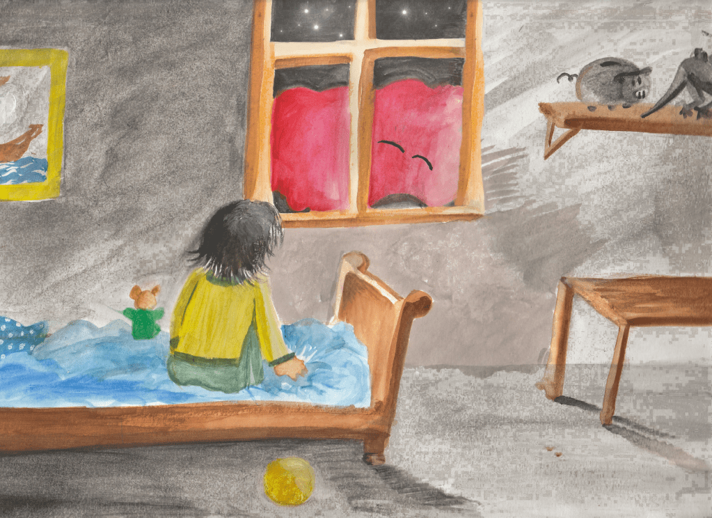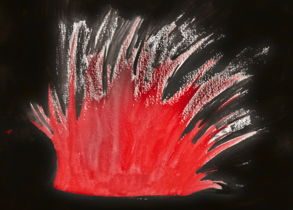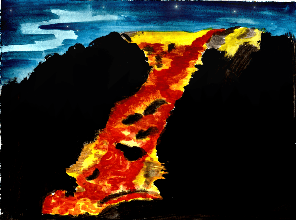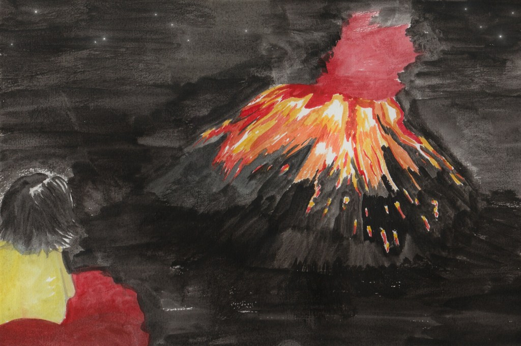 Dans la journée, l’enfant s’est mis en colère. La colère est montée, montée jusqu’à exploser comme une éruption. En voyant la lave du volcan exploser, ça lui fait peur. Il se dit que ce n’est peut-être pas une bonne idée de laisser exploser la colère.