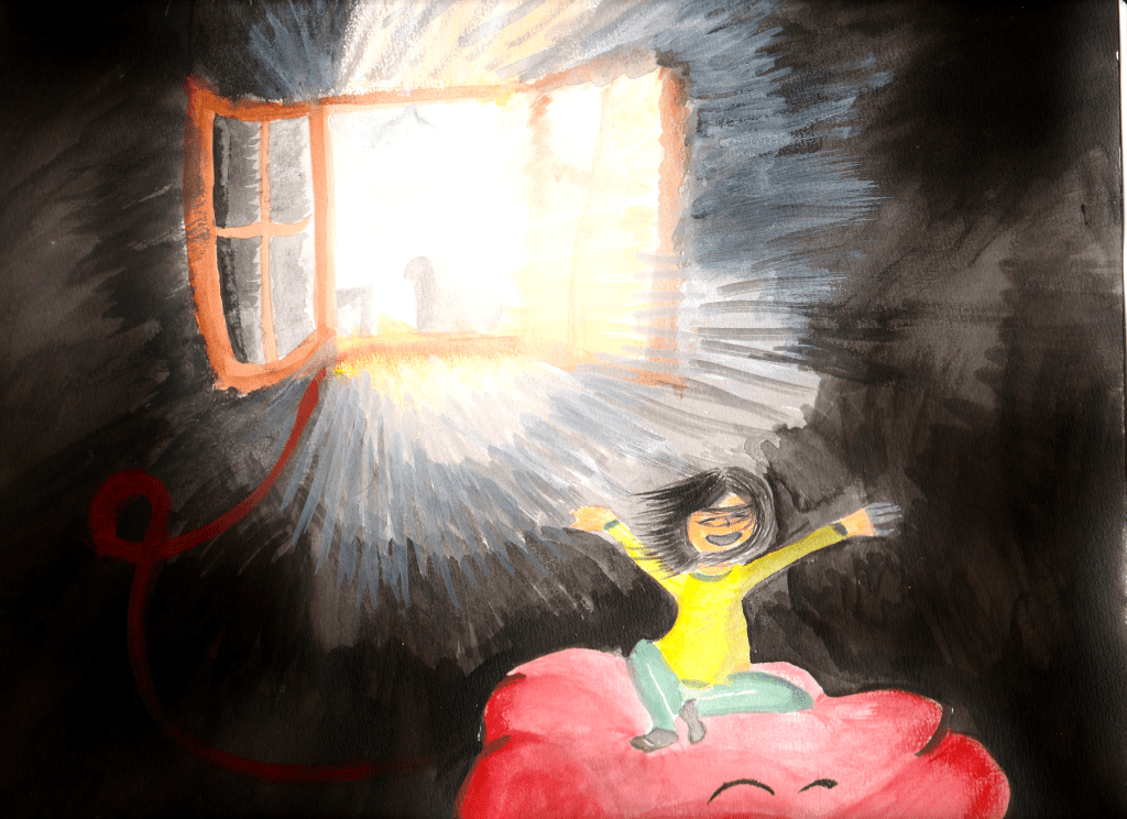 Au bout d’un moment, même les yeux fermés, j’ai remarqué que la luminosité de la chambre avait changée. Alors, j’ai ouvert mes yeux.
