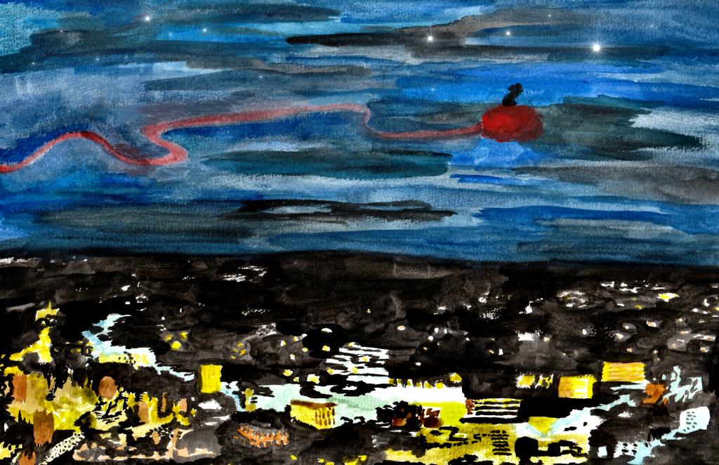 Il ne faisait même pas froid, l’enfant et le nuage rouge volaient entre la ville et les étoiles. Les petites lumières sous eux faisait penser à des chenilles brillantes en mouvement alors que celle du hauts paraissaient comme des bulles scintillantes suspendues. Il n’y avait aucun bruit à cette hauteur, pas même celui du vent.