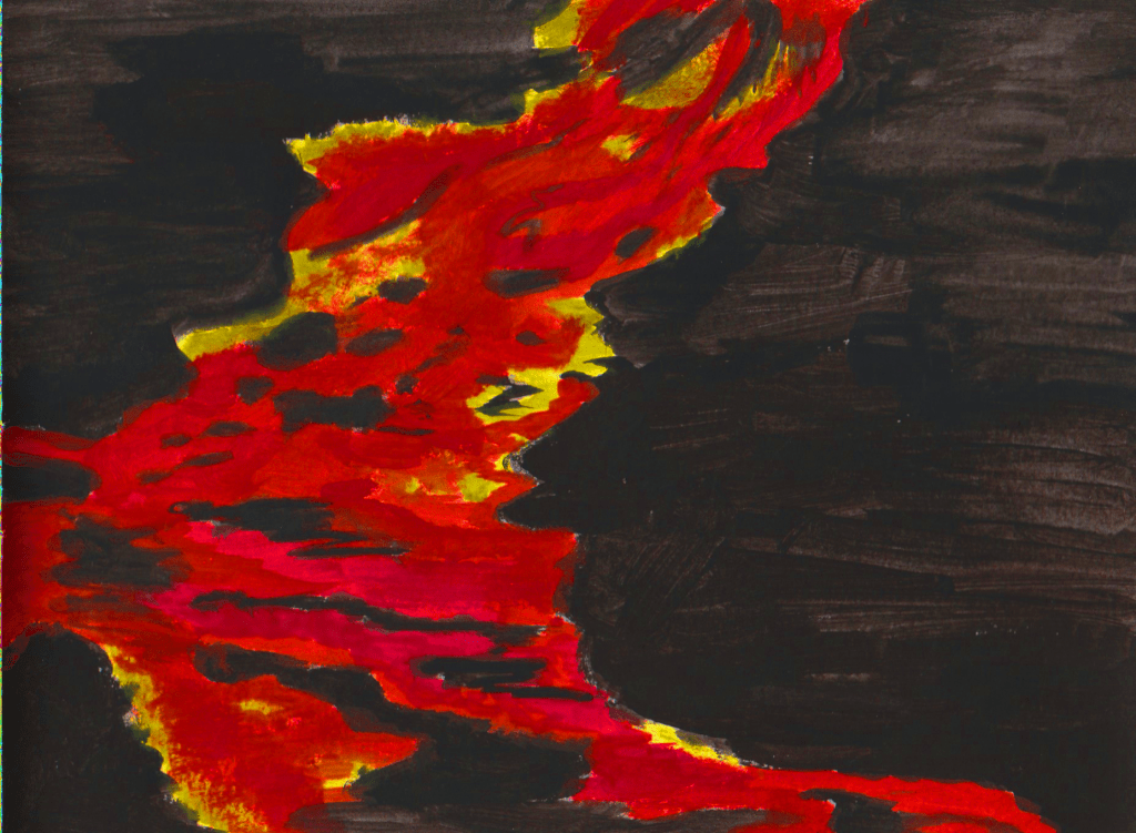 Mais en regardant la lave, avec ses belles couleurs pleines de chaleur se déverser lentement comme une rivière au ralenti, il se sent bien. La colère doit sortir mais petit à petit et s’en aller lentement sans faire d’explosion.