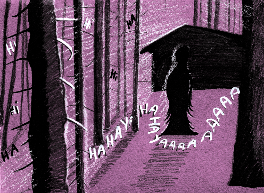 Chaque cabane dans les bois abrite une sorcière, s’imaginaient les petites lorsqu’elles étaient dans leur maison. Elles voyaient maintenant que c’était vrai, que celle-ci n’échappait pas à la règle car devant elles se tenait une grand femme dont les cheveux coiffés en queue de cheval étaient longs jusqu’aux genoux. Il était certain que c’était une sorcière, sûrement de celles qui font bouillir les enfants et toutes sortes de choses car un chaudron se trouvait justement dans l’âtre d’une petite cheminée, au fond de la pièce.