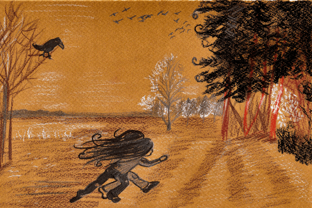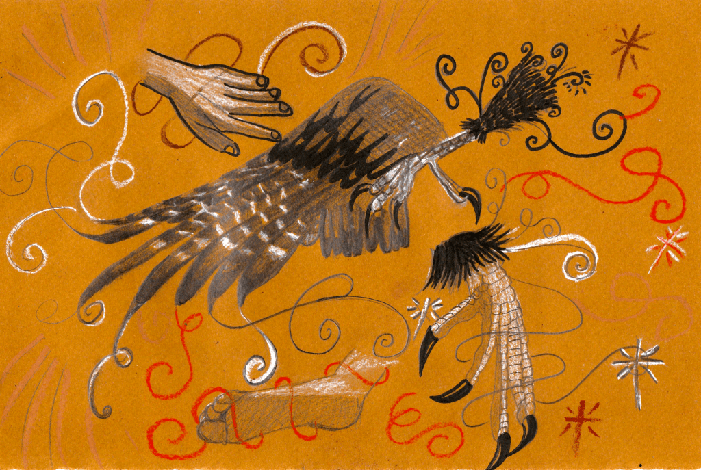L’autre sœur était si absorbée par le spectacle qu’elle mit un moment à remarquer que ses jambes était maintenant de longues pattes d’oiseaux au bout desquelles se trouvaient d’incroyables serres puissantes. Elle sautillaient et chantaient d’excitation quand elle se retrouvèrent face à face et se souvinrent aussitôt du défi. Elles se regardèrent, se sourirent et d’un seul mouvement elles prirent la poudre d’escampettes. L’une en courant, l’une en volant.