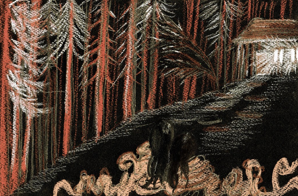 Les deux sœurs restèrent sans voix lorsque les racines se mirent à bouger, les transportant ainsi à travers la forêt. Sans parler, se regardant avec de grands yeux ronds, elle se demandaient quelle était leur destination. Les racines continuèrent leur chemin, se faufilant entre les arbres et quelques animaux, intrigués, s’arrêtaient pour observer cet étrange cortège.