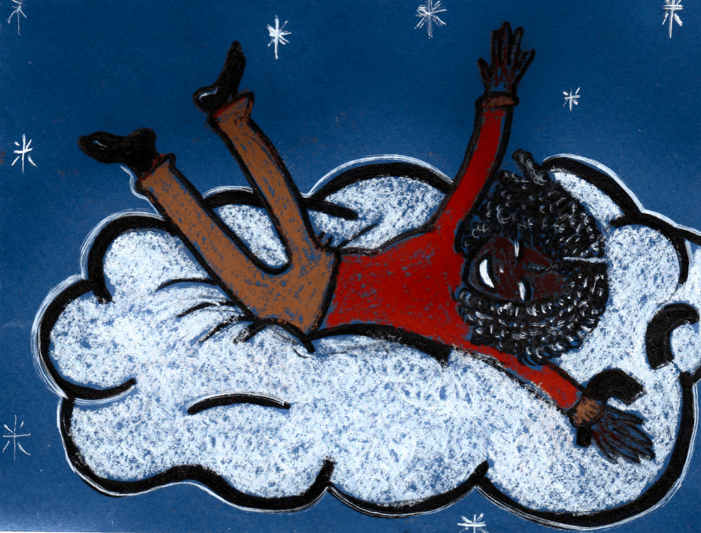 L’enfant grimpe sur le nuage rouge en commençant par un pied parce qu’il sait que les nuages sont de l’eau gazeuse que l’on passe à travers. Mais son pied prend place sur une surface moelleuse où il est possible de s’asseoir. A peine ses fesses posées sur le nuage rouge que ce dernier part en volant rapidement dans l’air de la nuit pour la plus grande joie de son passager.