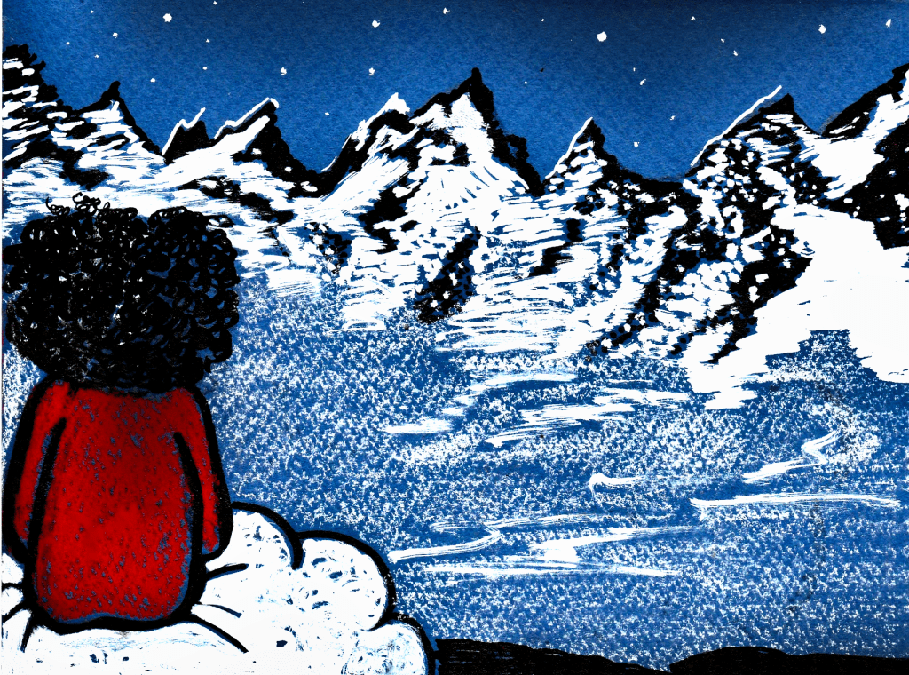 Ensuite le nuage blanc m’a emmené en altitude, haut, très haut ! Il s’est arrêté devant une vue blanche : il y avait la neige blanche, la brume blanche et la lueur des étoiles.